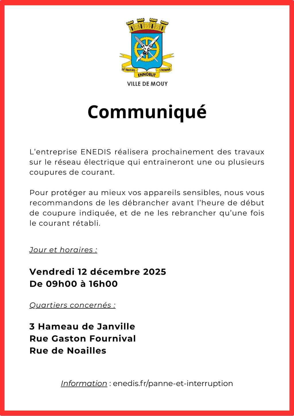 ⚠️ Coupure de courant prévue dans le cadre des travaux menés par la société ENEDIS ⚠️