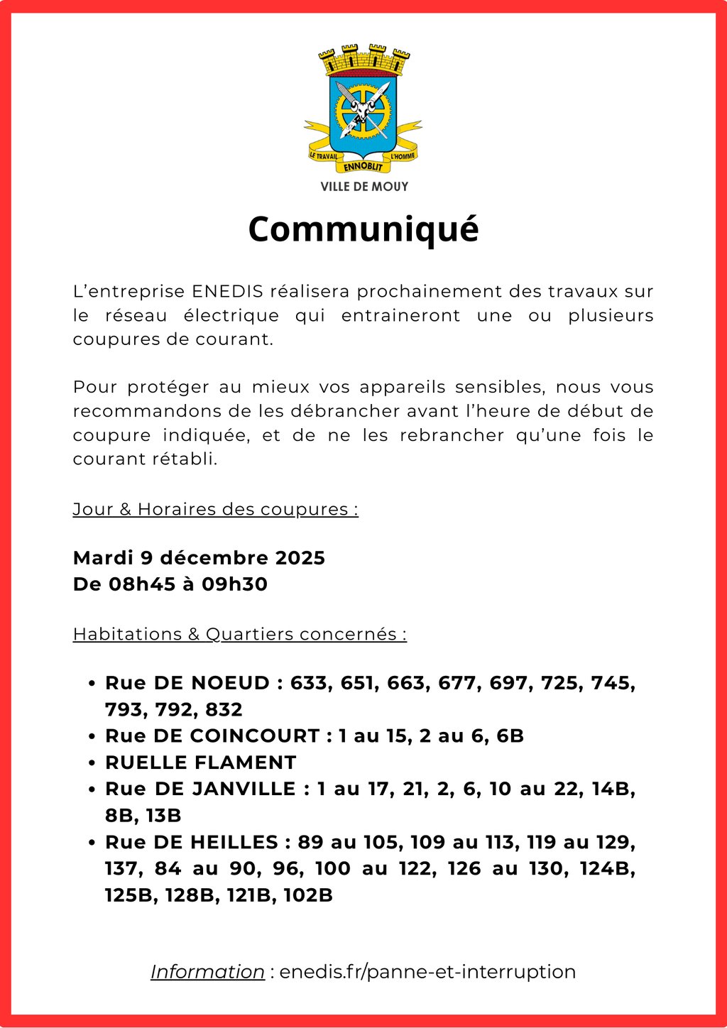 ⚠️ Dans le cadre de travaux réalisés par l'entreprise ENEDIS, des coupures de courant sont prévues⚠️