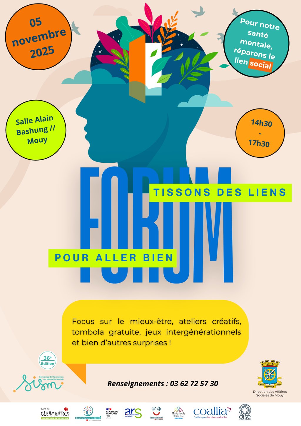 👉 Dans le cadre de la 36ᵉ édition des Semaines d’information sur la santé mentale (SISM), placée sous le thème : « Pour notre santé mentale, réparons le lien social », la Direction des affaires sociales de Mouy organise un forum dédié aux questions du mieux‑être, avec pour focus la nécessité de tisser des liens pour aller mieux, un enjeu qui nous concerne tous, quels que soient notre âge et notre parcours.