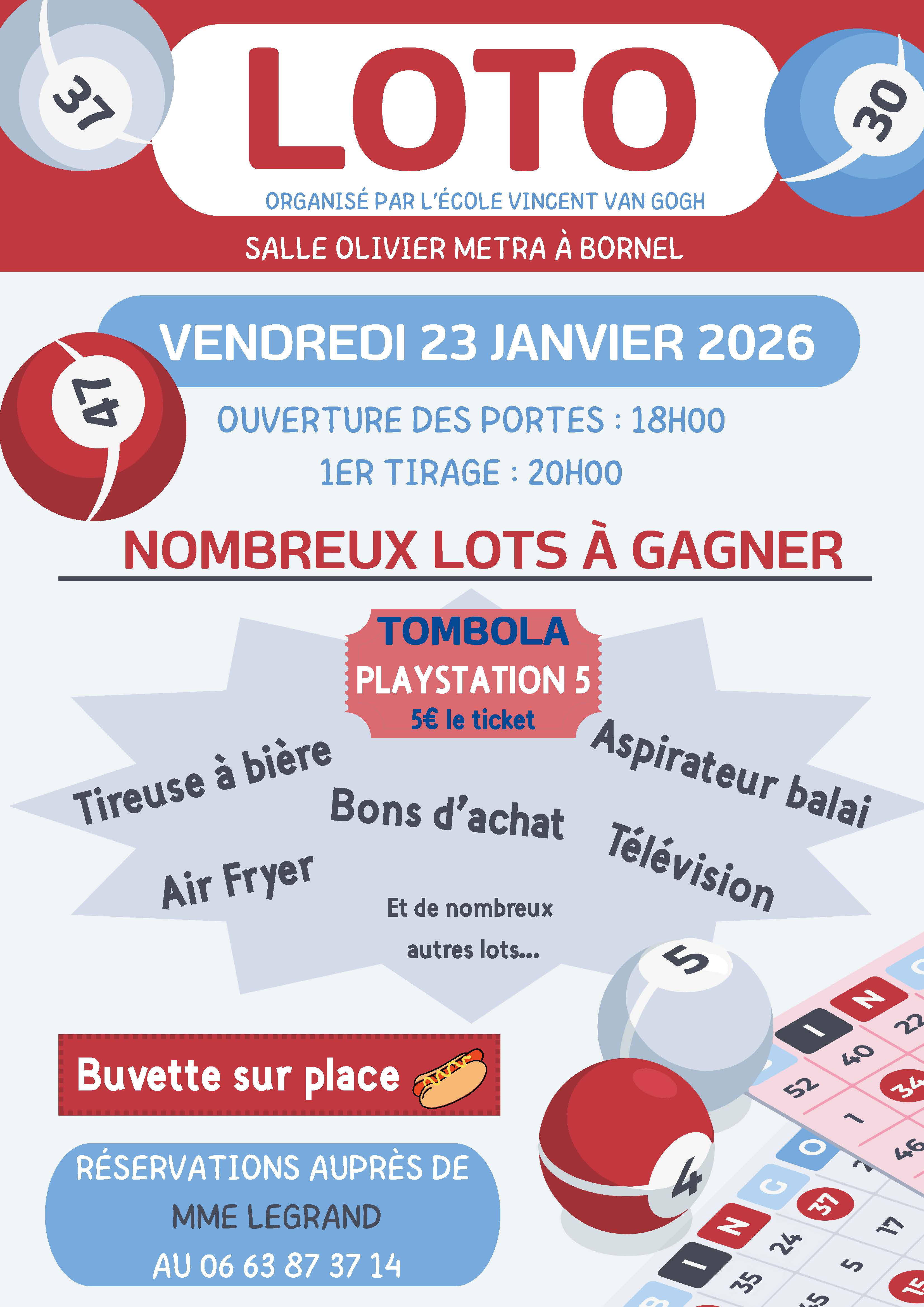 Loto organisé par l'école Vincent Van Gogh à la salle Olivier Métra le vendredi 23 janvier 2026.